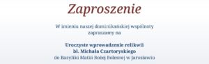 Wprowadzenie relikwiarza. Dominikanie z Jarosławia informują, że w niedzielę 21 grudnia odbędzie się uroczystość wprowadzenia relikwiarza bł. Michała Czartoryskiego do bazyliki Matki Bożej Bolesnej. Mszy świętej będzie przewodniczył ks. Arcybiskup Adam Szal. Będzie obecny również Prowincjał o. Łukasz Wiśniewski OP. Wydarzenie jest związane z rocznicą otrzymania sakramentu święceń przez bł. O. Michała, które przyjął 20 grudnia 1931, właśnie w jarosławskiej Bazylice. Od 18 do 20 grudnia, o. […]